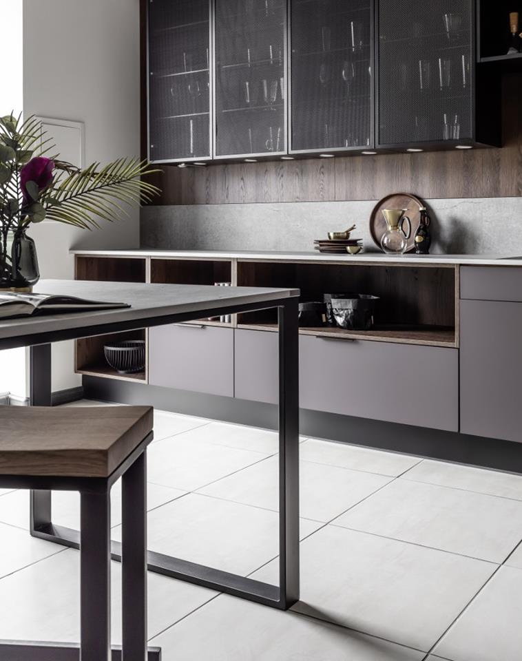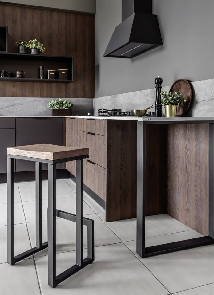 Stalowe, spawane podpory blatu, stołu i hokerów kształtują industrialny charakter kuchni Penelopa / Piombo.